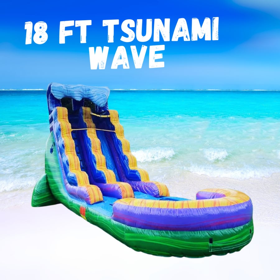 Looking to add a splash of excitement to your next event? Look no further than our 18 FT Tsunami Wave Waterslide! This epic waterslide stands tall at 18 feet, stretches 29 feet long, and spans 9 feet wide, ensuring a thrilling experience for all ages.